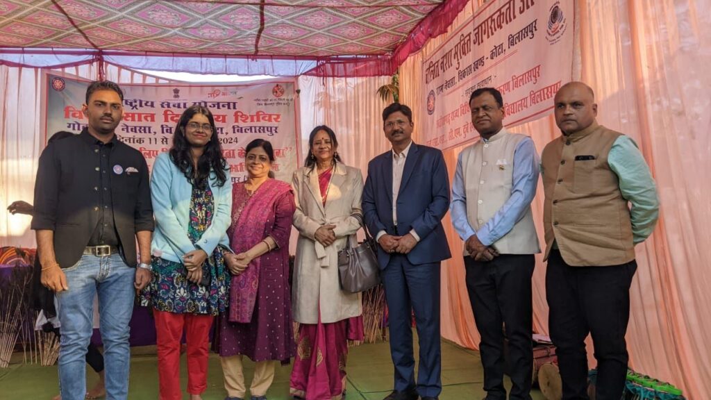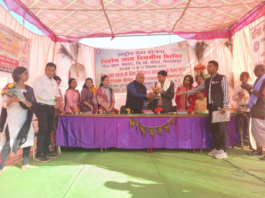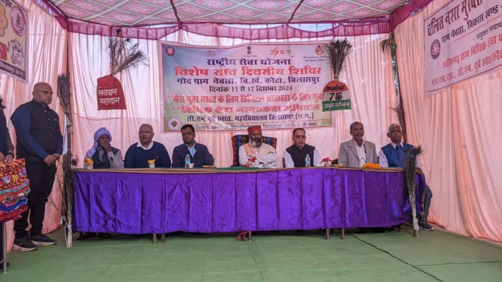 सी.एम.दुबे स्नातकोत्तर महाविद्यालय के राष्ट्रीय सेवा योजना का शिविर गोद ग्राम नेवसा में 11 दिसंबर से 17 दिसंबर तक आयोजित है महाविद्यालय विगत कई वर्षों से एनएसएस इकाई के माध्यम से ग्राम नेवसा में समाज सेवा के कार्य लगातार सफलतापूर्वक कार्य कर रहा है । गत कई शिविर का आयोजन पूर्व में भी किया जा चुका है । महाविद्यालय के एन एस एस के विद्यार्थि सरकार के विभिन्न कल्याणकारी योजनाओं को आदिवासीयों इलाकों में जाकर उनकी सहायता करते है, इस हेतु महाविद्यालय द्वारा आदिवासियों अंचलों में नशा मुक्ति, विधिक साक्षरता अभियान, स्वच्छता और स्वस्थ संबंधित अभियान चलाया जा रहे है। गोद ग्राम नेवसा को केंद्र बनाकर पटैता, सरायपाली, गोबरीपाट, शिवतराई, निकटाबंधा, कारखा, लिटिया,दवनपुर, जाकर लोगो में जागरूकता फैला रहे है। इसी तारतम्य में गोद ग्राम नेवसा के सात दिवसीय शिविर में मुख्य अतिथि के रूप में न्याय मूर्ति रमाशंकर प्रसाद जी एवं अटल बिहारी वाजपेई विश्वविद्यालय के कुलपति आचार्य प्रो.ए.डी.एन.बाजपेई जी एवं जिला विधिक प्राधिकरण के माननीय राकेश सिंह सोरी जी तथा शासी निकाय के अध्यक्ष डॉ संजय दुबे , अटल बिहारी वाजपेई विश्वविद्यालय के समन्वयक डॉ मनोज सिन्हा एवं प्रभारी प्राचार्य डॉ संजय सिंह का गोद ग्राम नेवसा में आगमन हुआ। न्याय मूर्ति प्रसाद जी ने अपने संबोधन में राष्ट्रीय सेवा योजना के बारे में प्रकाश डालते हुए कहा कि, अनुशासन सेवा भाव और राष्ट्र के प्रति समर्पण ही राष्ट्रीय सेवा योजना का मूल आधार रहा है। गांधी जी के सपनों को साकार करने के लिए गांव – गांव में स्वच्छता और जागरूकता अभियान जरूरी है। क्योंकि अनेक गांव के समूह से ही राज्य और राष्ट्र का निर्माण होता है अतः ग्रामीण समस्याओं का निदान जरूरी है और इस क्षेत्र में राष्ट्रीय सेवा योजना का कार्य सराहनीय रहा है। उन्होंने विधिक साक्षरता , लैगिंग समानता , नशा बंदी , डिजिटल साक्षरता के बारे में भी विस्तार से चर्चा की। एवं सामाजिक कल्याण के क्षेत्र में अच्छे कार्य करने के लिए सी.एम. डी कॉलेज के राष्ट्रीय सेवा योजना के विद्यार्थियों को प्रोत्साहित किया विद्यार्थियों द्वारा निर्मित मंदिर निर्माण , तालाब निर्माण , गार्डन के पौधों का अवलोकन किया उनके द्वारा चलाए गए स्वच्छता कार्यक्रम को भी देखा तथा उन्हें बधाई दी कार्यक्रम अधिकारी डॉ के के शुक्ला कार्यक्रम संयोजक रोहित लहरे और महाविद्यालय के प्रबंधक डॉ. संजय दुबे, प्राचार्य डॉ. संजय सिंह जी को शुभकामनाएं दी। पहाड़ी क्षेत्र में फलदार पौधे उगाए और मंदिर का निर्माण किया जिसका लोकार्पण कुलपति महोदय द्वारा किए गए माननीय कुलपति महोदय अपने उद्बोधन में कहा कि गांव में जाकर स्वयंसेवकों ने समाज के साथ 
