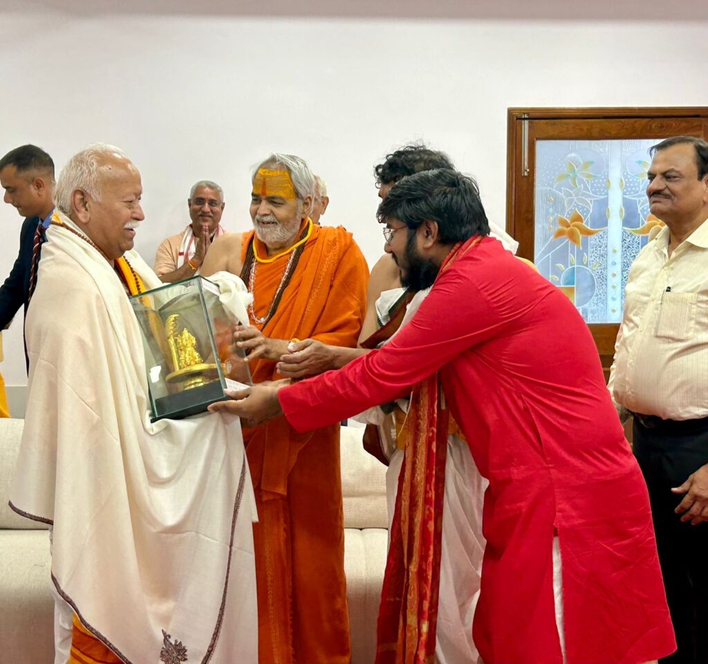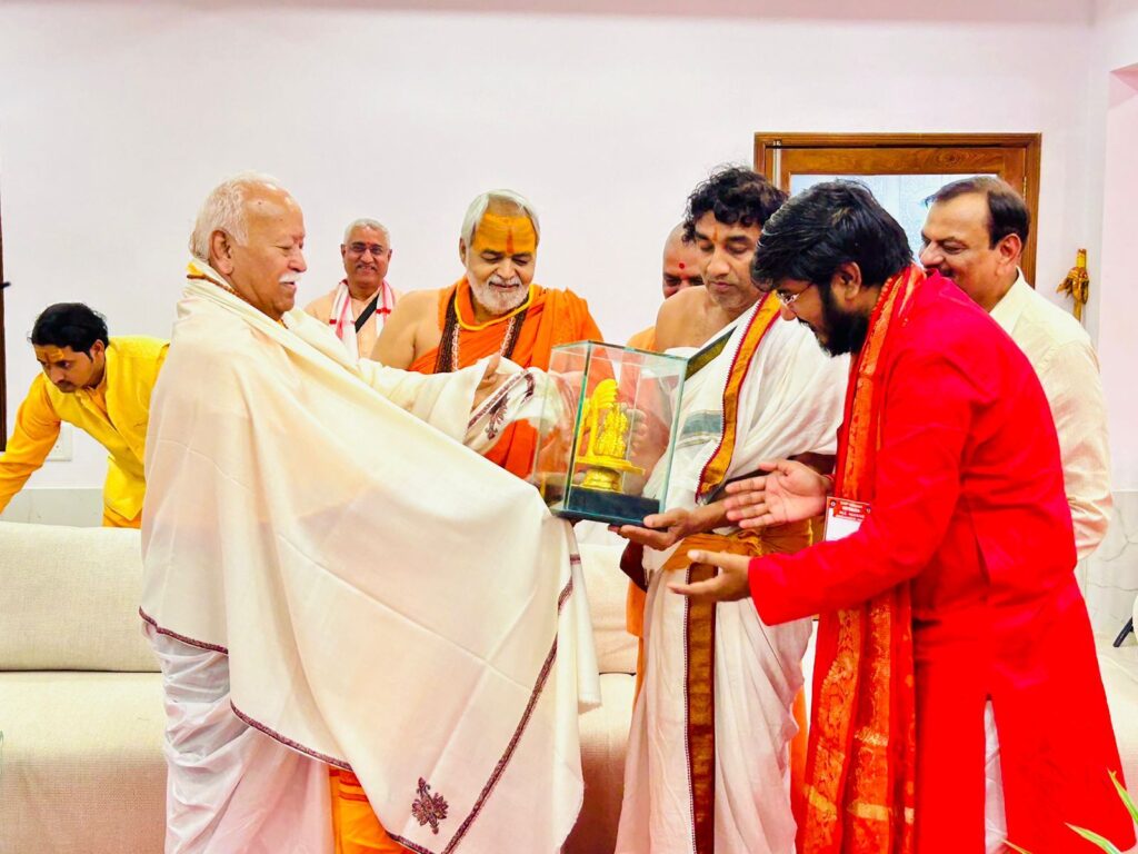 श्री मोहन भागवत जी को विनायक शर्मा ने शॉल ओढ़ाकर एवं महादेव का शिवलिंग भेंट कर स्वागत किया।