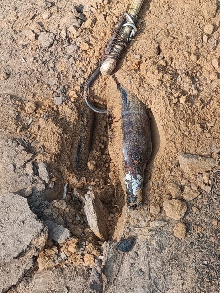 थाना आवापल्ली क्षेत्रान्तर्गत आवापल्ली-बासागुड़ा मार्ग पर मुरदण्डा के समीप पगडंडी मार्ग पर माओवादियों के द्वारा लगाये गये 02-02 किग्रा के 02 IED किये गये बरामद