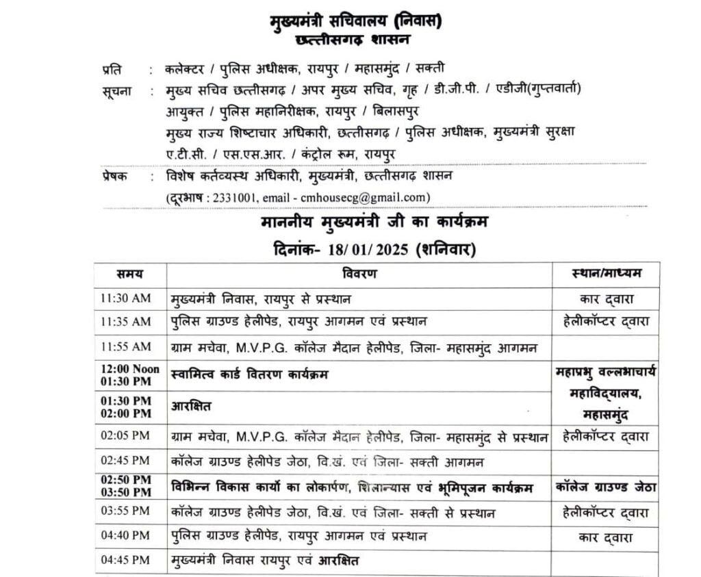 सीएम साय पुलिस ग्राउंड हेलीपैड रायपुर से सुबह 11:35 बजे महासमुंद के लिए हेलीकॉप्टर से रवाना होंगे, और 11:55 बजे महासमुंद पहुंचेंगे कार्यक्रम समाप्ति पश्चात सीएम साय दोपहर 02:05 बजे शक्ति के लिए प्रस्थान करेंगे।