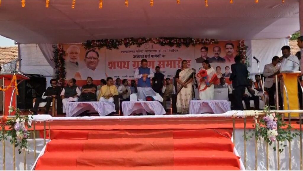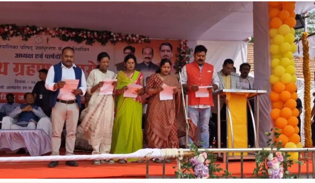 समारोह में एसडीएम जशपुर ने अध्यक्ष एवं सभी पार्षदों को वार्डवार शपथ दिलाई। इस अवसर पर मुख्यमंत्री ने नवनिर्वाचित अध्यक्ष और पार्षदों को बधाई देते हुए कहा कि वे नगर को स्वच्छ, सुव्यवस्थित और समृद्ध बनाने की दिशा में कार्य करेंगे और जनता की उम्मीदों पर खरा उतरने का प्रयास करेंगे।