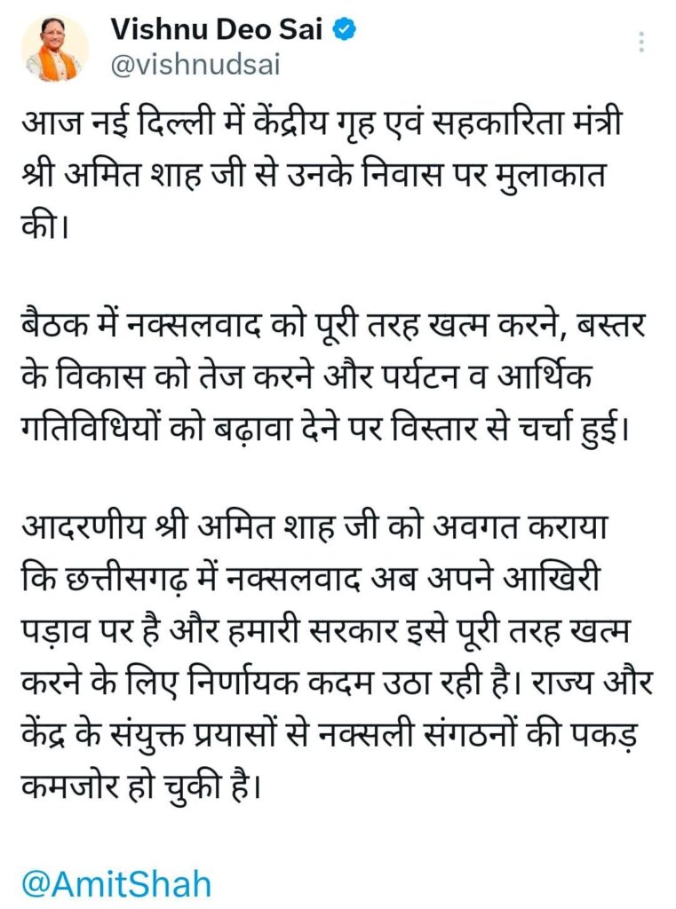 आदरणीय अमित शाह जी को अवगत कराया कि छत्तीसगढ़ में नक्सलवाद अब अपने आखिरी पड़ाव पर है और हमारी सरकार इसे पूरी तरह खत्म करने के लिए निर्णायक कदम उठा रही है। राज्य और केंद्र के संयुक्त प्रयासों से नक्सली संगठनों की पकड़ कमजोर हो चुकी है।