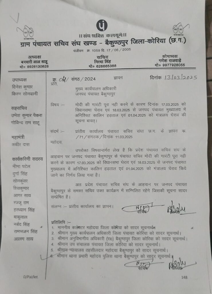 सरकार की अनदेखी के चलते पंचायत सचिव संघ ने 17 मार्च को विधानसभा घेराव, 18 मार्च से ब्लॉक मुख्यालयों में अनिश्चितकालीन हड़ताल और 1 अप्रैल को मंत्रालय घेराव करने का फैसला लिया है।