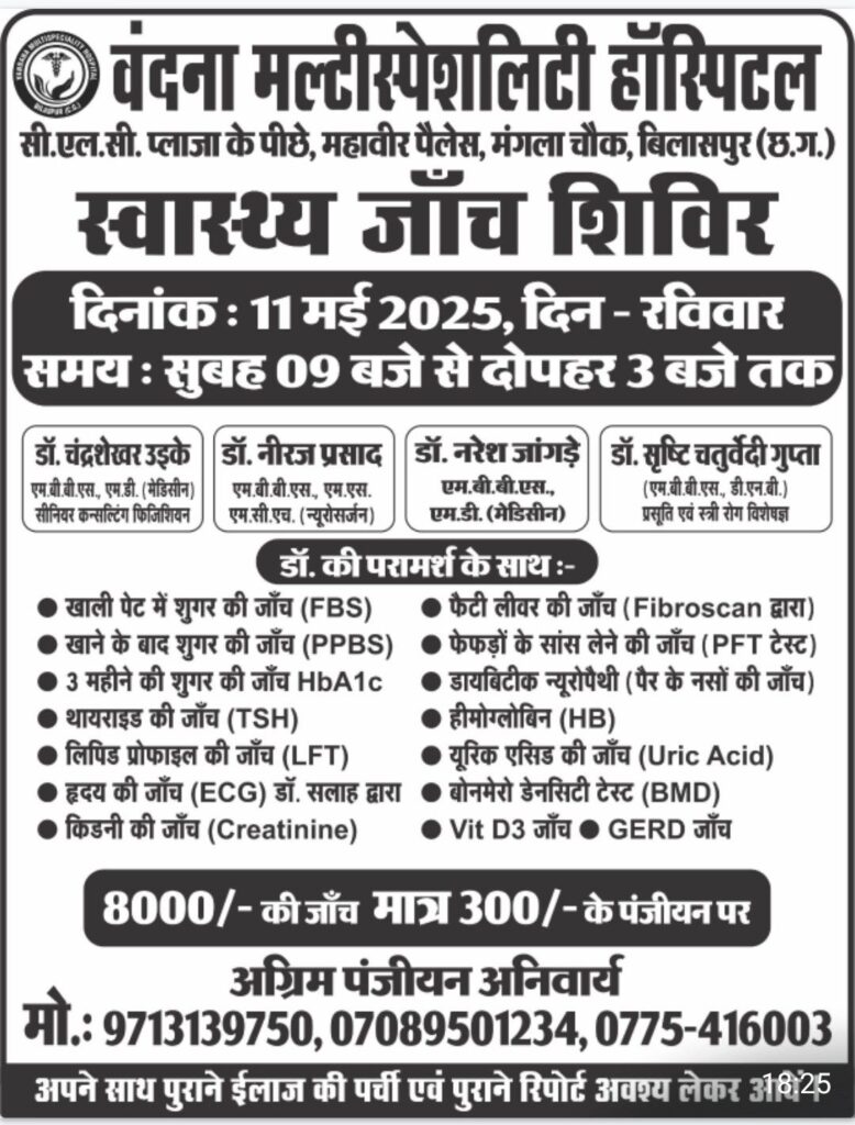 वंदना मल्टी स्पेशलिस्ट हॉस्पिटल में स्वास्थ्य जाँच शिविर रविवार को