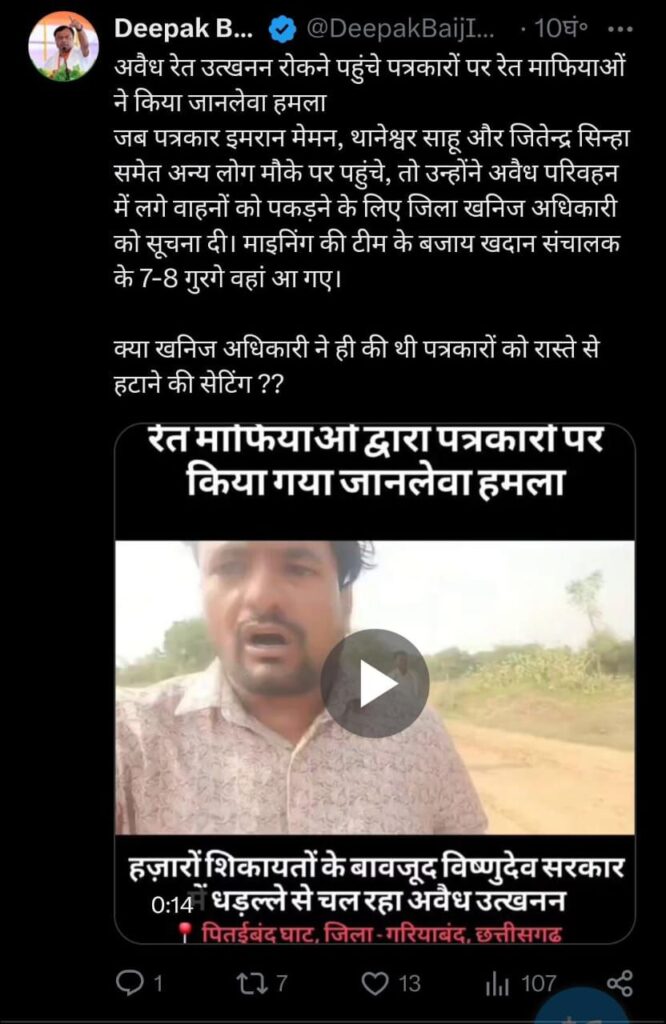 अवैध रेत खनन कवरेज करने गए पत्रकारों की पिटाई वीडियो कॉल पर मिली धमकियां, राजिम में 8 अवैध घाट, 14 चैन माउंटेन से 24 घंटे हो रही खुदाई