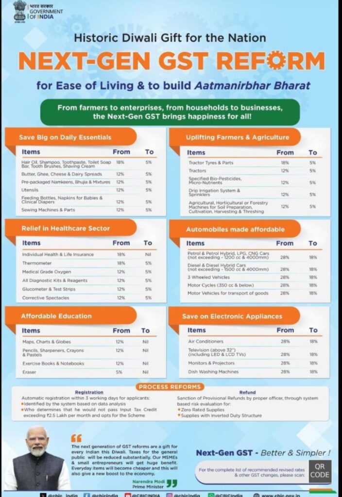 22 सितम्बर 2025 से लागू किए जाने की घोषणा इन नये बदलावों से आम उपभोक्ताओं, छोटे व्यवसायियों एवं उद्योग जगत को बड़ी राहत मिलेगी। सरकार ने जो GST स्लैब में सरलीकरण निश्चित रूप से आर्थिक वृद्धि को गति देंगे और जनता को राहत प्रदान करेंगे।