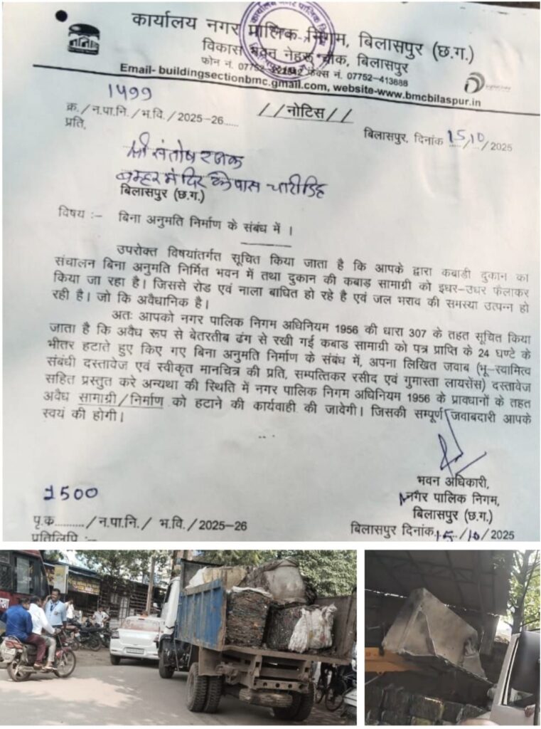 बिलासपुर में कबाड़ी संतोष रजक पर नगर निगम की बड़ी कार्रवाई — अवैध निर्माण पर नोटिस, हाल ही में 5 टन चोरी का लोहा और धारदार हथियार के साथ हुआ था गिरफ्तार