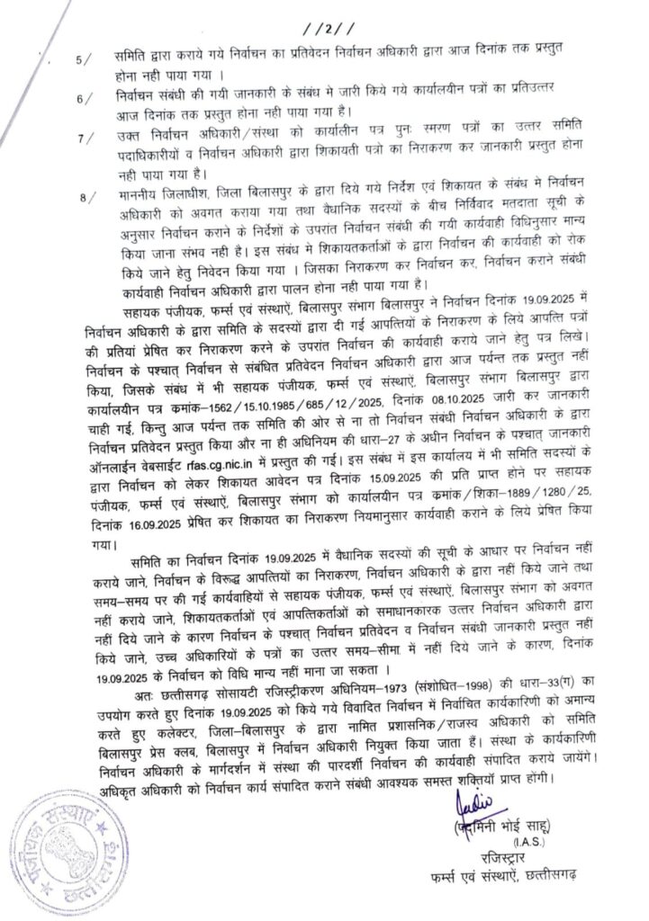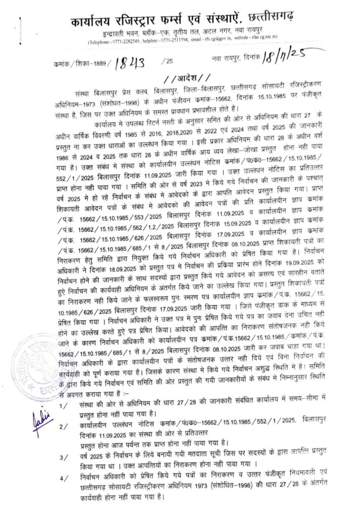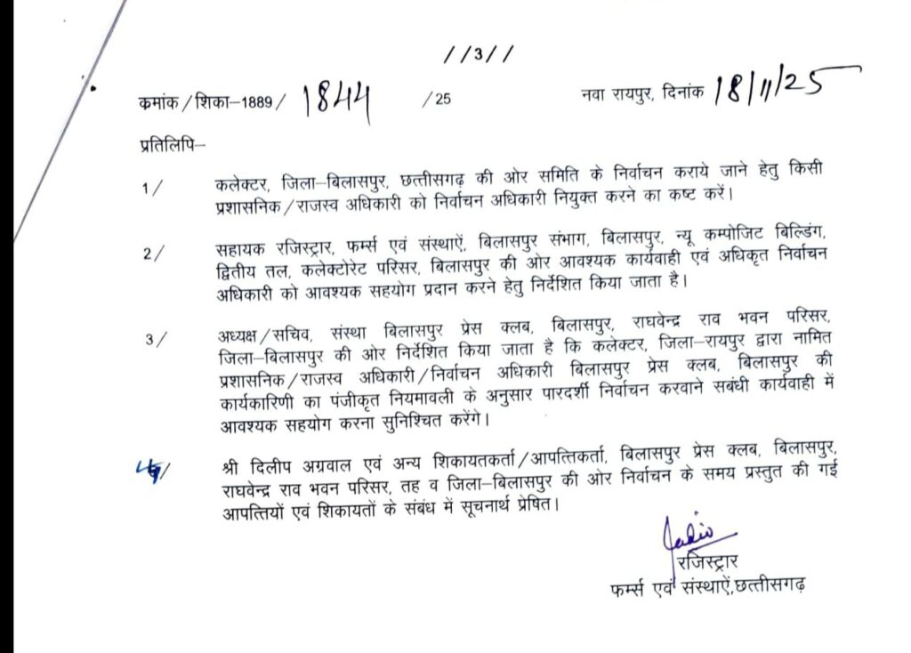 बिलासपुर प्रेस क्लब के बहुचर्चित चुनाव को लेकर बड़ा अपडेट सामने आया है। छत्तीसगढ़ शासन के रजिस्ट्रार, फर्म्स एवं संस्थाएं विभाग ने बिलासपुर प्रेस क्लब के वर्ष 2024-25 के लिए प्रस्तावित चुनाव को पूरी तरह निरस्त कर दिया है। यह आदेश 18 नवंबर 2025 को जारी किया गया, जिसमें स्पष्ट रूप से कहा गया है कि चुनाव प्रक्रिया के दौरान निर्धारित नियमों का पालन नहीं किया गया और निर्वाचन अधिकारी की ओर से आवश्यक दस्तावेज व रिपोर्ट समय पर उपलब्ध नहीं कराई गई।