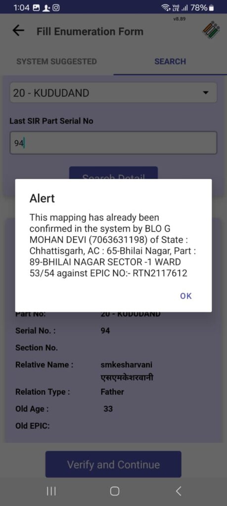 बिलासपुर के पूर्ब ज़िला कांग्रेस अध्यक्ष व 2023 के विधान सभा के चुनाव में बेलतरा विधान सभा से कांग्रेस के प्रत्याशी विजय केशरवानी का नाम Sir में गंभीर लापरवाही करते हुए भिलाई में मैपिंग कर दिया गया है जिसके कारण विजय केशरवानी का नाम। बिलासपुर ज़िले में अभी तक नहीं जुड़ पाया है जब कि 2003 के वोटर लिस्ट में भी विजय केशरवानी का नाम बिलासपुर में ही दर्ज है