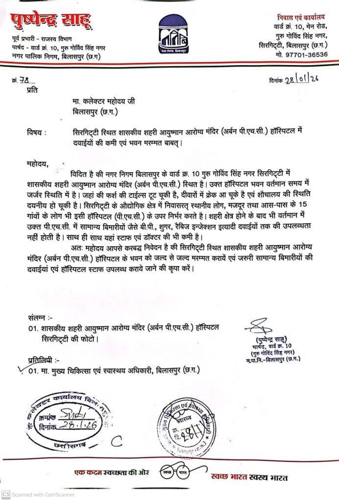 सूत्रों की माने तो आरोग्य स्वास्थ्य केंद्र जो सिरगिट्टी इंडस्ट्रियल छेत्र सहित आस पास के कई गांव का सुरक्षा केंद्र है उसके बाद भी यहां कोई व्यवस्था नहीं है जबकि इसको लेकर वार्ड 10के पार्षद के शिकायत के बाद भी कुछ सुधार नहीं हुआ आखिर कार जनता के हित में दावा तो खूब करते है लेकिन मौके पर जा कर देखने पर स्थिति कुछ और होती है